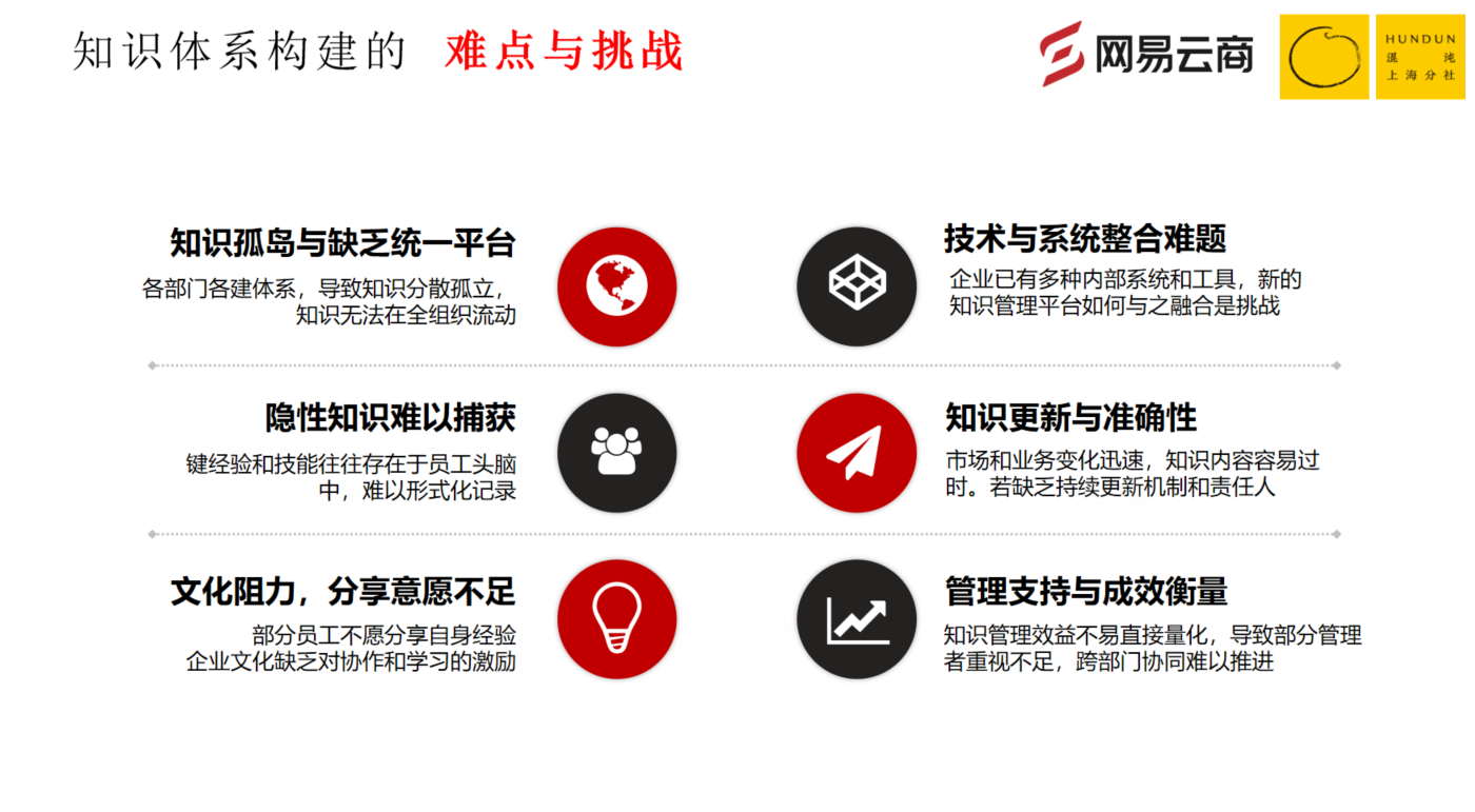 “很多企业以为‘大模型够强,AI Agent就好用’,其实80%的问题出在知识管理上。”宗鸣在分享中着重强调,知识管理是AI项目成功的首要因素,若企业知识存在 “孤岛化、更新慢、隐性难捕获” 等问题,即便模型参数再高,也会出现 “答非所问”“信息过时” 的情况,甚至产生误导用户的 “幻觉”。结合网易云商服务数千家企业的经验,他现场拆解了知识管理的 6 大核心痛点及对应解决方案。